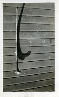 A 'fossil bone' attatched to the side of Fred Francis's home in Kawanee, IL. The letter that provides context, as noted on the back, is currently not in the Archives' posessions.