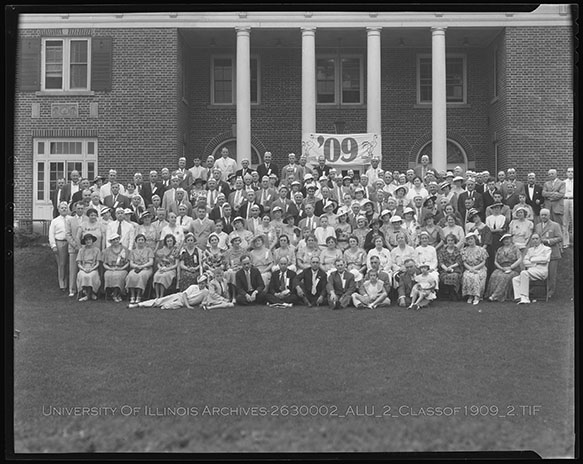Alumni of the class of 1909 gather for their 30th year class reunion in front of the former Delta Chi building at 1111 S. First St, Champaign.