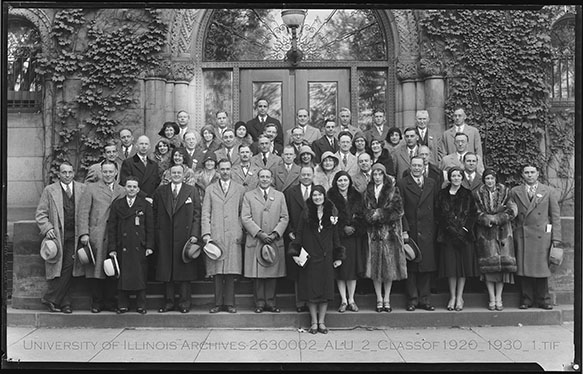 Alumni of the class of 1920 gather for their 10-year reunion on the main steps in front of the Altgeld Building facing the north direction.