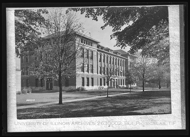 Southern Face of the Physics Laboratory, now Material Sciences Building. Designed in 1907, completed in November 1909, and dedicated by Illinois governor Charles Deneen on November 26th, 1909. The physics laboratory was built with a $250,00 appropriation by the Illinois legislature to be a state-of-the-art facility.