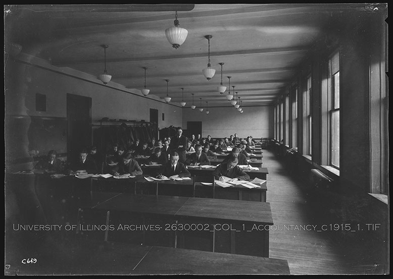 Students sit in rows for an accountancy exam. The department of accountancy was formerly a concentration in the economics department until 1915 until it was brought into part of the Department of Business Organization. Accountancy was originally its own department; it was fused with the College of Commerce and Business in 1953. Image is presumed to be inside the David Kinley Commerce building.