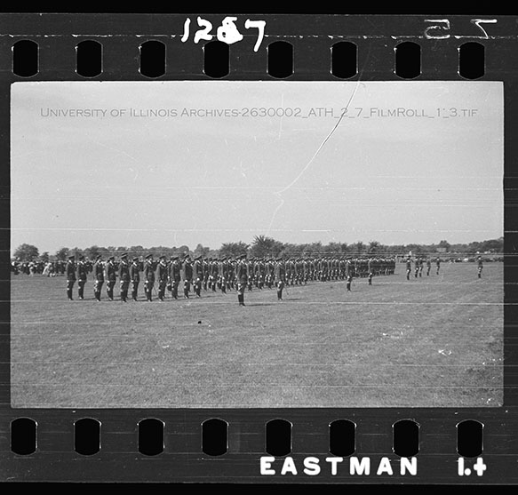 Undergraduate members of the different branches of the military at the University of Illinois assemble in rank for the annual Military Day on the Military Field just south of Memorial Stadium. Military Day was a showcase for the Reserve Officer Training Corps members (ROTC), Infantry, Cavalry, Field Artillery, Coast Artillery, Engineers, and Signal Corps to the university administration and military leaders. Due to the volatile nature of Nitrate Film, digital file can be found at: https://medusa.library.illinois.edu/cfs_files/54134288
