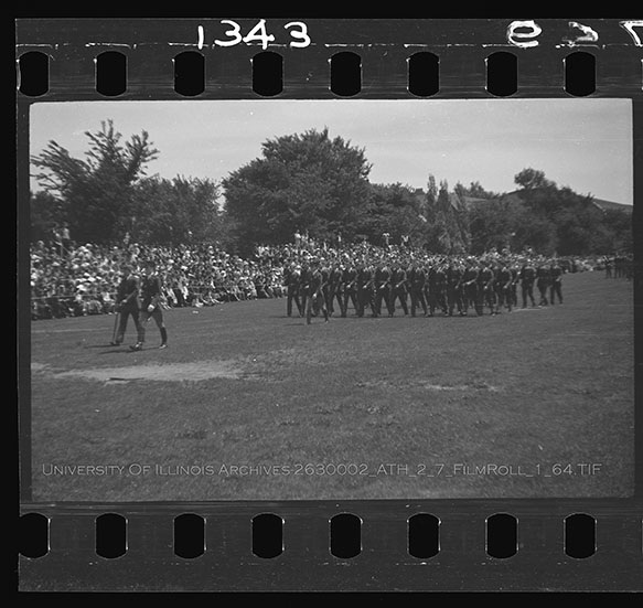 Undergraduate members of the different branches of the military at the University of Illinois assemble in rank for the annual Military Day on the Military Field just south of Memorial Stadium. Military Day was a showcase for the Reserve Officer Training Corps members (ROTC), Infantry, Cavalry, Field Artillery, Coast Artillery, Engineers, and Signal Corps to the university administration and military leaders. In this series of images, the Infantry, Signal Corps, and Cavalry are shown processing in a military parade around the Military Field. Due to the volatile nature of Nitrate Film, digital file can be found at: https://medusa.library.illinois.edu/cfs_files/54134364
