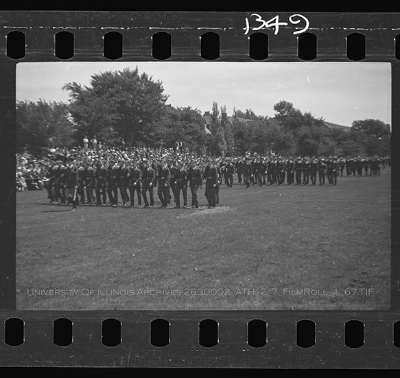 Undergraduate members of the different branches of the military at the University of Illinois assemble in rank for the annual Military Day on the Military Field just south of Memorial Stadium. Military Day was a showcase for the Reserve Officer Training Corps members (ROTC), Infantry, Cavalry, Field Artillery, Coast Artillery, Engineers, and Signal Corps to the university administration and military leaders. In this series of images, the Infantry, Signal Corps, and Cavalry are shown processing in a military parade around the Military Field. Due to the volatile nature of Nitrate Film, digital file can be found at: https://medusa.library.illinois.edu/cfs_files/54134370