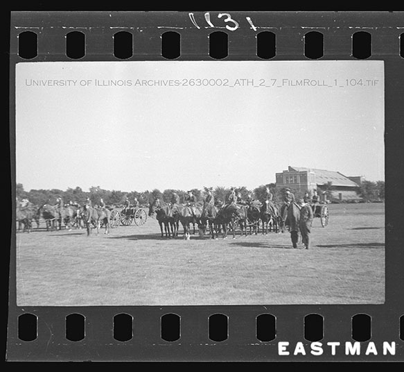 Undergraduate members of the different branches of the military at the University of Illinois assemble in rank for the annual Military Day on the Military Field just south of Memorial Stadium. Military Day was a showcase for the Reserve Officer Training Corps members (ROTC), Infantry, Cavalry, Field Artillery, Coast Artillery, Engineers, and Signal Corps to the university administration and military leaders. In this series of images, the Infantry, Signal Corps, and Cavalry are shown processing in a military parade around the Military Field. Due to the volatile nature of Nitrate Film, digital file can be found at: https://medusa.library.illinois.edu/cfs_files/54134238