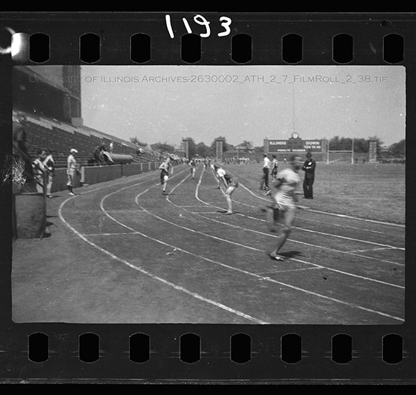 Illinois High School students participate in track and field events at the Interscholastic Track Meet in May 1936. This two-day event, held May 15th and 16th, brought over 600 students from across the state to compete in Memorial Stadium in this pre-cursor to the IHSA State Meet. This image features students running what appears to be the 3rd exchange of the 4x100 meter race. Due to the volatile nature of Nitrate Film, digital file can be found at: https://medusa.library.illinois.edu/cfs_files/54134506