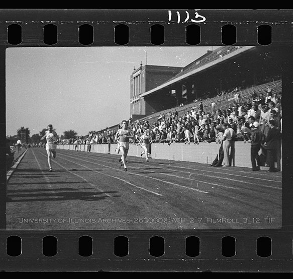 Illinois High School students participate in track and field events at the Interscholastic Track Meet in May 1936. This two-day event, held May 15th and 16th, brought over 600 students from across the state to compete in Memorial Stadium in this pre-cursor to the IHSA State Meet. This image features students running what appears to be the 400 meter sprint. Due to the volatile nature of Nitrate Film, digital file can be found at: https://medusa.library.illinois.edu/cfs_files/54134524