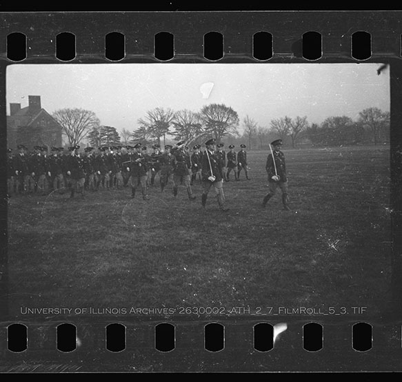A fall military review day of the university Military is featured with all branches of the military and the military band present. The fall review does not feature the same pomp and circumstance of the spring review day. Consequently, R.O.T.C members are featured but not awarded honors. Instead, at the fall review, the Pershing Rifle Awards and the artillery showcase is demonstrated to the public. Due to the volatile nature of Nitrate Film, digital file can be found at: https://medusa.library.illinois.edu/cfs_files/54134732