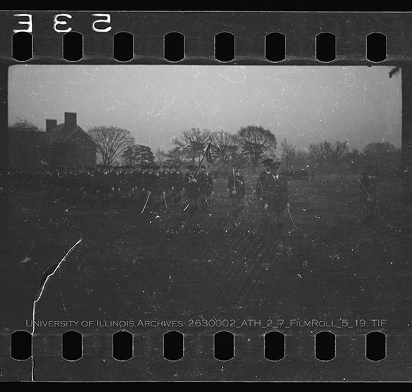 A fall military review day of the university Military is featured with all branches of the military and the military band present. The fall review does not feature the same pomp and circumstance of the spring review day. Consequently, R.O.T.C members are featured but not awarded honors. Instead, at the fall review, the Pershing Rifle Awards and the artillery showcase is demonstrated to the public. Due to the volatile nature of Nitrate Film, digital file can be found at: https://medusa.library.illinois.edu/cfs_files/54134708