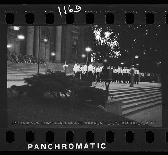 The different men's choir groups assemble on the steps of Foellinger Hall for their annual honors concert. The choirs are to honor the mortarboard inductees and new members of the Atius and Sachem honors societies. Due to the volatile nature of Nitrate Film, digital file can be found at: https://medusa.library.illinois.edu/cfs_files/54134846