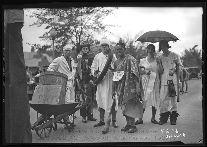 Featured are marchers in the annual Hobo Parade in downtown Champaign. The Hobo Parade was an annual event where people dressed up on costumes and attire resembling that of hobos. However, on campus, this expanded to different outfits and disguises meant to satirize elements of the Champaign Urbana community.