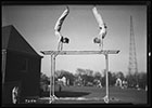 Image features members of the interscholastic circus practicing and performing their acts like walking on their hands, the tightrope, axe juggling, and trapeze artistry. Because the circus was traditionally held under the lights of Memorial Stadium field, these images show performers doing their routines on the military practice field just north of the stadium. Presumably, this image series was taken during the daytime practices before their night-time performance.