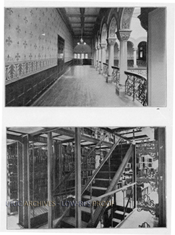 Two interior photos of Altgeld Hall when it was the Library Building. The top image is of the upper floor balcony and the bottom image is of the stacks. This image is from a Library Building Pamphlet.