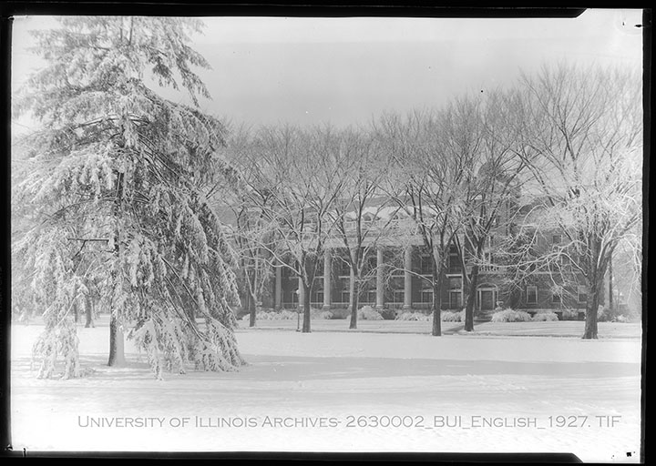 The English Building, formerly the Womens Dormitory. In 1937, the building was renovated into the English Building for instruction from a residential space. This building would have been a dormitory at this point. The external facade of this building is notable for its pineapple-tipped towers and neo-Georgian columns out front. This image features the building covered in snow during the winter.