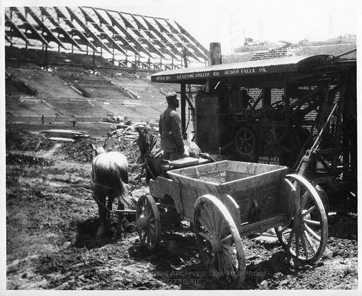 Man Stands with Steam Shovel in Memorial Stadium | University of Illinois Archives