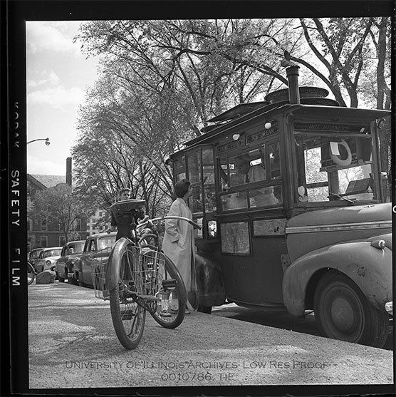 Two female students step off their bikes to communicate with a man inside a food truck. The truck, labeled 'pure food', 'ice cream', and 'hot peanuts' appears to be a precursor to modern food trucks. The vehicle is parked along the east side of South Wright Street, meaning the the building featured in the background is the south entrance to the campus library.