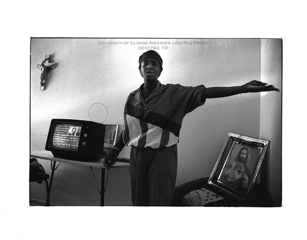 Rosa Lee Cunningham, the subject of his work, Rosa Lee: A Mother and Her Family in Urban America, stands in aswetclothes with a TV in the background.