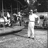 Photograph showing a WILL TV presenter in front of carousel with children in the background on the carousel or in line for candy apples.