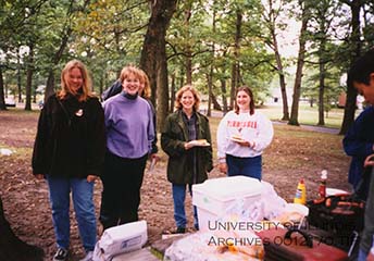 A photograph of a cookout held by the Society of Women Engineers in 1998. The women featured are Kathy Barnes, Mary Beth Grant, Christine Frett, and Amee Green.