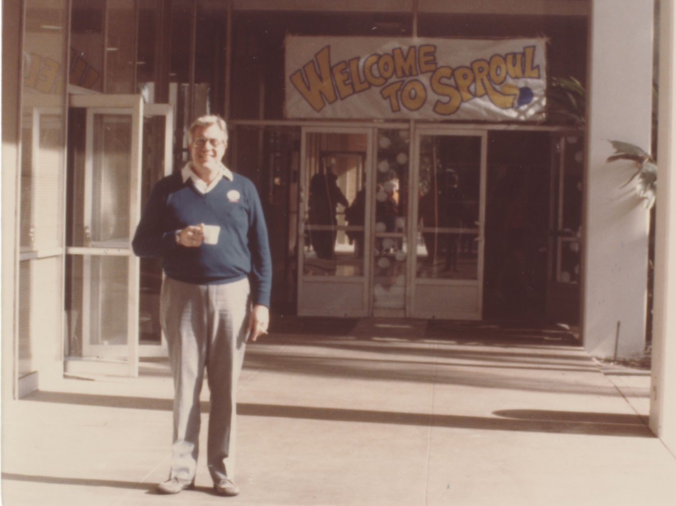 Man Outside Building with Sign 'Welcome to Sproul'