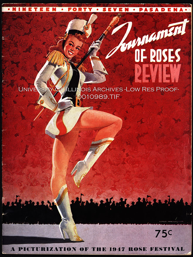 Cover of the Tournament of Roses Review, a "picturization" of the 1947 Rose Festival/Rose Parade/Tournament of Roses Parade held before the Rose Bowl football game between Illinois and UCLA.