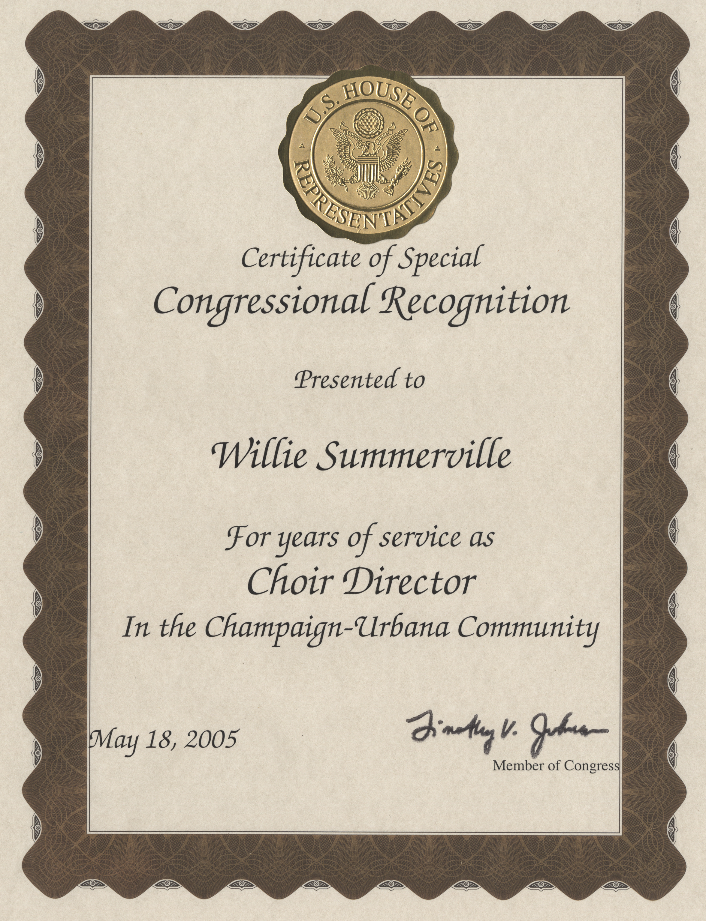 U.S. House of Representatives Congressional Reconition Award for Service to the Champaign-Urbana Community