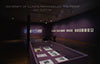 Image from Francesa Woodman: Photgraphic Work exhibit at the Krannert Art Museum. The exhibition lasted from January 22 to February 28, 1988. "E50P" is printed on the slide in black ink. Four empty chairs face each other in an empty exhibition room. On the right side, a long purple wall has several photographs and black name plates. A large blue photograph hangs on the wall in the back. A column sits unilluminated in near a display case sits featuring information about the exhibit.