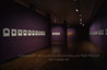 Image from Francesa Woodman: Photgraphic Work exhibit at the Krannert Art Museum. The exhibition lasted from January 22 to February 28, 1988. "E50P" is printed on the slide in black ink. The exhibit hall is dimly lit and features a wooden floors. The walls were painted purple and the right side of the image consists of a single wall with photographs and black name plates. Three walls are visible on the left side of the image. The wall in the back has a large brown image. The other two walls features smaller photographs and black name plates.