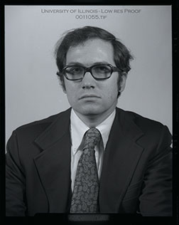 Black and white portrait of Harry Cook, former head of the Department of General Engineering. Cook is wearing thick dark rimmed glassess. He is in a dark colored suit and wearing a paisley patterned tie. The folder lists his department as Metallurgy and the image order number as 168-106.