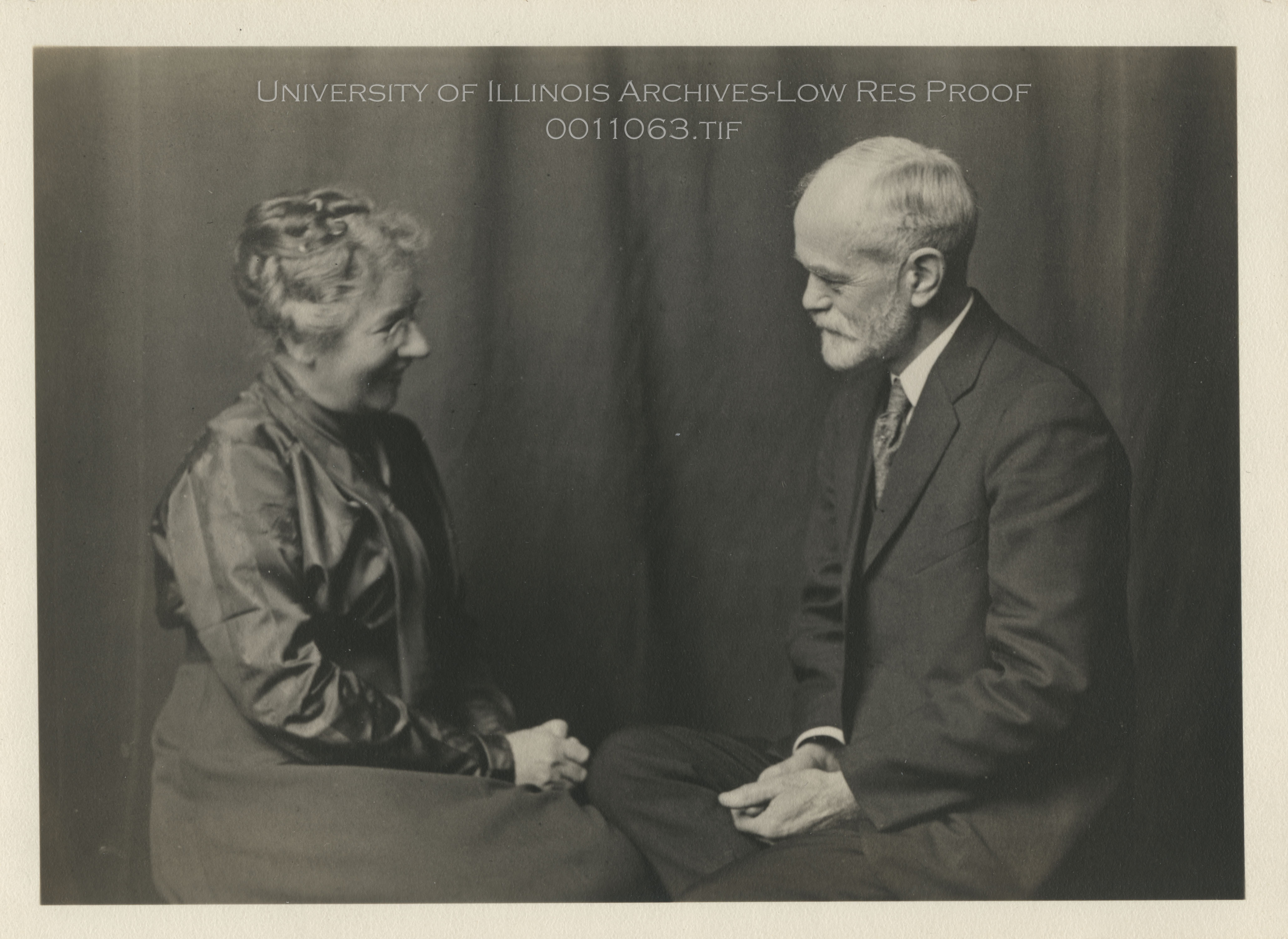 Photo of Dean Eugene Davenport and his wife, Emma. They are sitting in front of a curtain and looking at each other. Dean Davenport is wearing a suit with a tie and Mrs. Emma Davenport is wearing a bloiuse, skirt, and glasses. They are smiling at each other.
