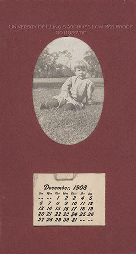 Photo and calendar of a young Sam Trelease. He is sitting in a field side-saddle style. Trees are visible in the background of the photo. The calendar shows December 1908, and there are remnants of past calendar pages.The photo is embedded into a red mat. The back has the following written in pencil: "Merry Christmas to Grandma from Sam." There is also typed text in white font stating the inlaid calendar mat is patented by the House Co., Makers from Boston.