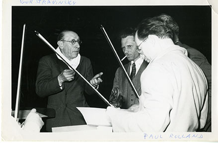 Igor Stravinsky conducting the University of Illinois Symphony Orchestra, John Kuypers director of the ensemble, and Paul Rolland as principal violinist