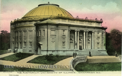 Illustration of the Auditorium at the University of Illinois rendered by hand in color.