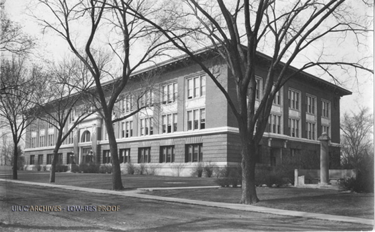 Lincoln Hall as viewed from the northeast, showing elm trees along the walkway in front of the building and the bench and pillar memorial given as a gift by the Class of 1912 on the north side of the building.