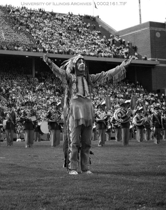Chief Illiniwek, portrayed by an unidentified student, presumably during halftime of an Illinois home football game at Memorial Stadium.