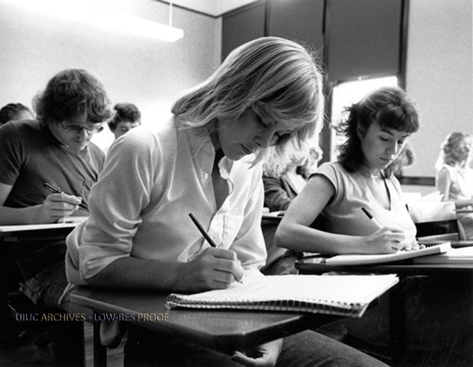 Black and white photograph of students taking notes on paper while seated in a classroom. Close shot.