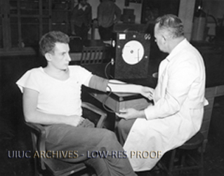 Professor Thomas K. Cureton takes a man's blood pressure as part of studies on physical fitness.
