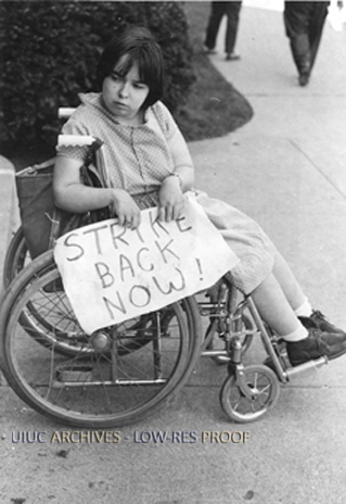 A girl in a wheelchair holds a sign that says 'Strike Back Now!'