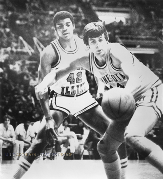 Mark Smith of Illinois defends Minnesota star, Kevin McHale, in a game at Assembly Hall. The Illini won 60-58 in overtime.