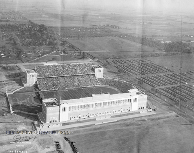 Aerial view, looking southeast, of Memorial Stadium filled with a large crowd during the dedication game against the University of Michigan.