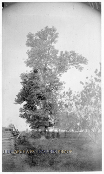 View of three people standing under a Populus monilifera tree, which was planted roughly in 1845 in dry soil in Richland County, IL.