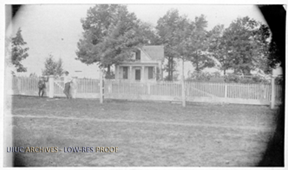View of a farm house near Olney in Richland County, IL, with two men standing at the gate to the picket fence. This is the same farm house from "Richland County - Farm House Near Olney" images (2, 3, 4 and 5)