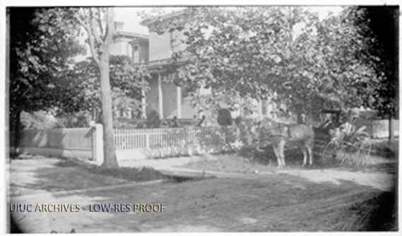 Residence in Olney, IL with a horse and buggy waiting outside of the picket fence and several people close to the residence.