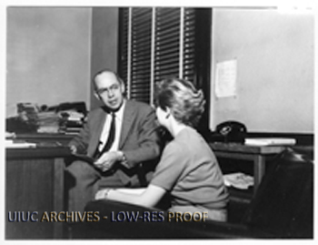 William Gilbert, University of Illinois professor and administrator, speaks with a young woman as part of student counseling.