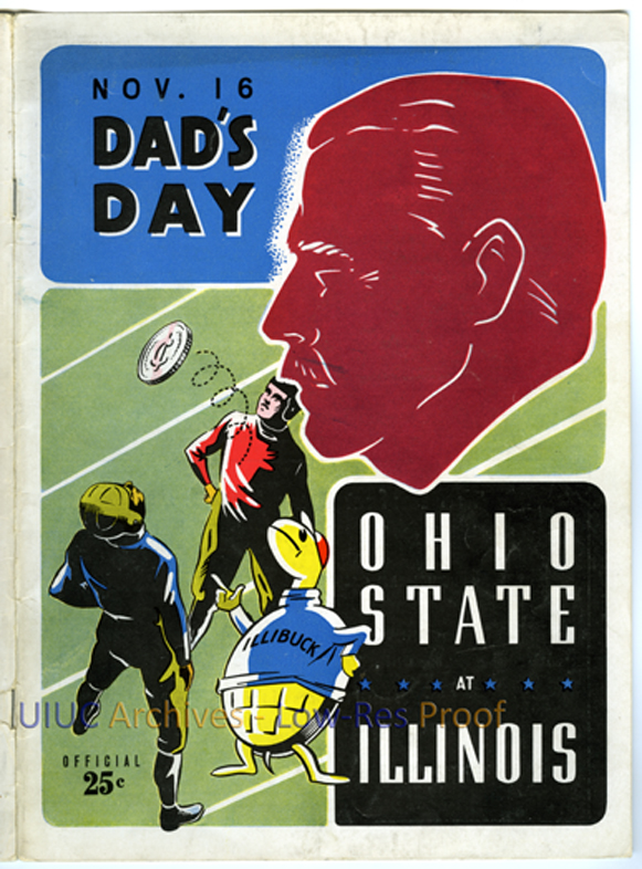 Cover of the program from the match between the Illini and the Buckeyes at Illinois' Memorial Stadium in 1940. Illinois lost 6-14. This cover features the Illibuck, the trophy that annually goes to the winner of this match-up, performing the coin toss.
