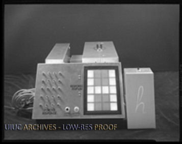 View of the interface terminal of the Visual Image Processor created by J.K. Russel at the University of Illinois in 1966. To the right of the output terminal is the figure 'h' and on the screen is the output which was processed as 'H'