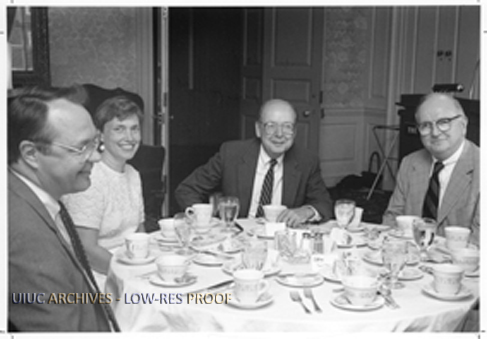 Morton Weir (center), Chancellor of the University of Illinois at Urbana-Champaign, sits with three other individuals at a table during a luncheon.