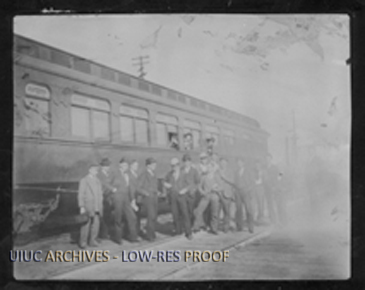 Several Illinois football players stand for a picture in street clothes along side a train during their trip west in the fall of 1892.