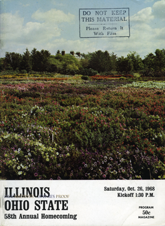 Cover of the program for the match between the Illini and the Buckeyes at Memorial Stadium in Champaign. The Flower Trial Garden near the University President's house is featured on the cover. Illinois lost 24-31.