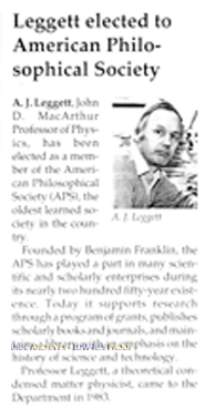Profile and photograph in UIUC Physics News of Anthony Leggett, University of Illinois professor of physics, regarding his election to the American Philosophical Society.